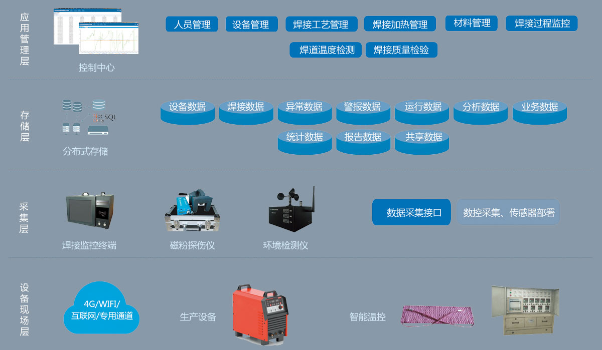 系统简介船体焊接全过程质量追踪与分析系统对船体焊接质量影响因素分部门、分区域、分时段进行信息化追踪与管理,对焊工资质、原材料质检与发放,焊接电流、电压、环境温湿度及风速,焊缝探伤记录等数据文件进行采集、记录、存储、跟踪与回溯。系统可实现船体焊接全过程与焊接质量相关施工信息的自动化管理,对从材料进厂到船体焊接完工全过程中的过程数据实现有效跟踪,能够有效加强焊接过程的质量监控,实现船体焊接过程“人”、“机”、“料”、“法”、“环”等诸要素的可追溯性,为提高焊接质量,保证船体建造质量奠定基础。