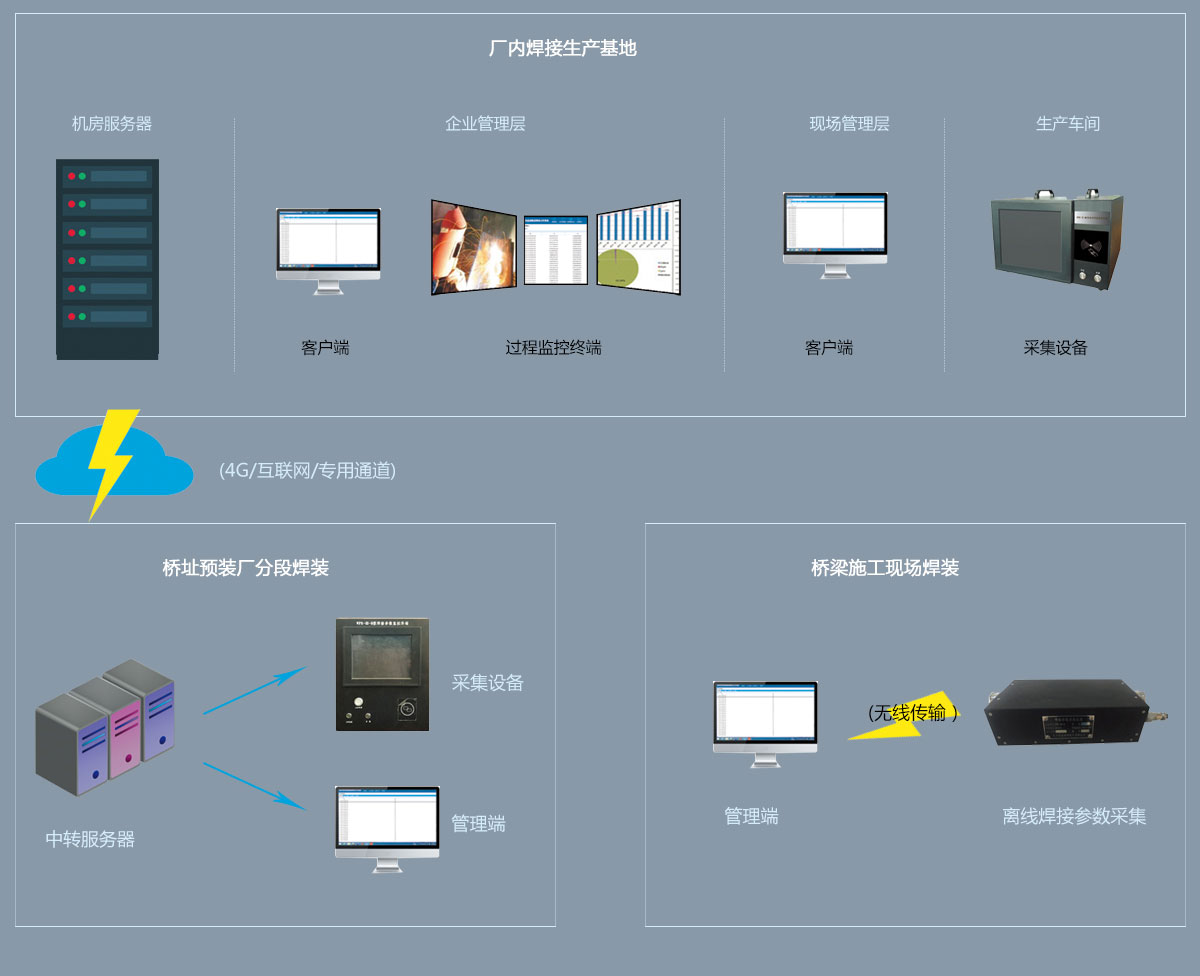 智能桥梁钢结构焊接信息管理系统对桥梁钢构建造焊接全过程实施数字化监控管理,有效解决不同品牌不同型号的焊机数字化问题,避免手工记录的繁琐和人为误差,同时对焊接中间产品及其焊接参数的动态变化进行实时监控和存储,实现对桥梁钢构建造焊接工艺全过程数字化监控,控制焊接作业流程,保证每个焊接工艺的完整性,可追溯性,实现高质量焊接的目的。